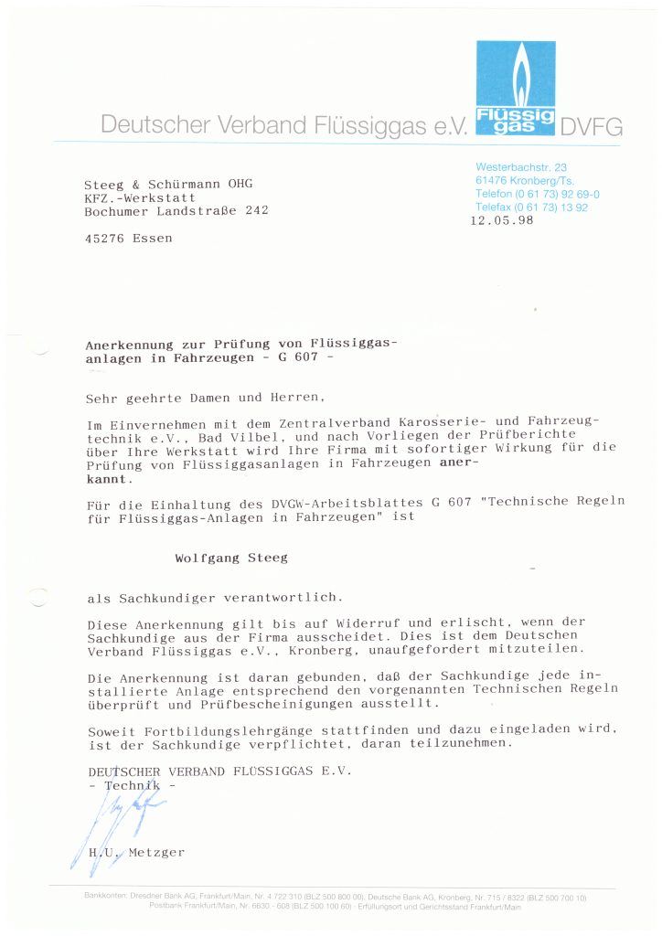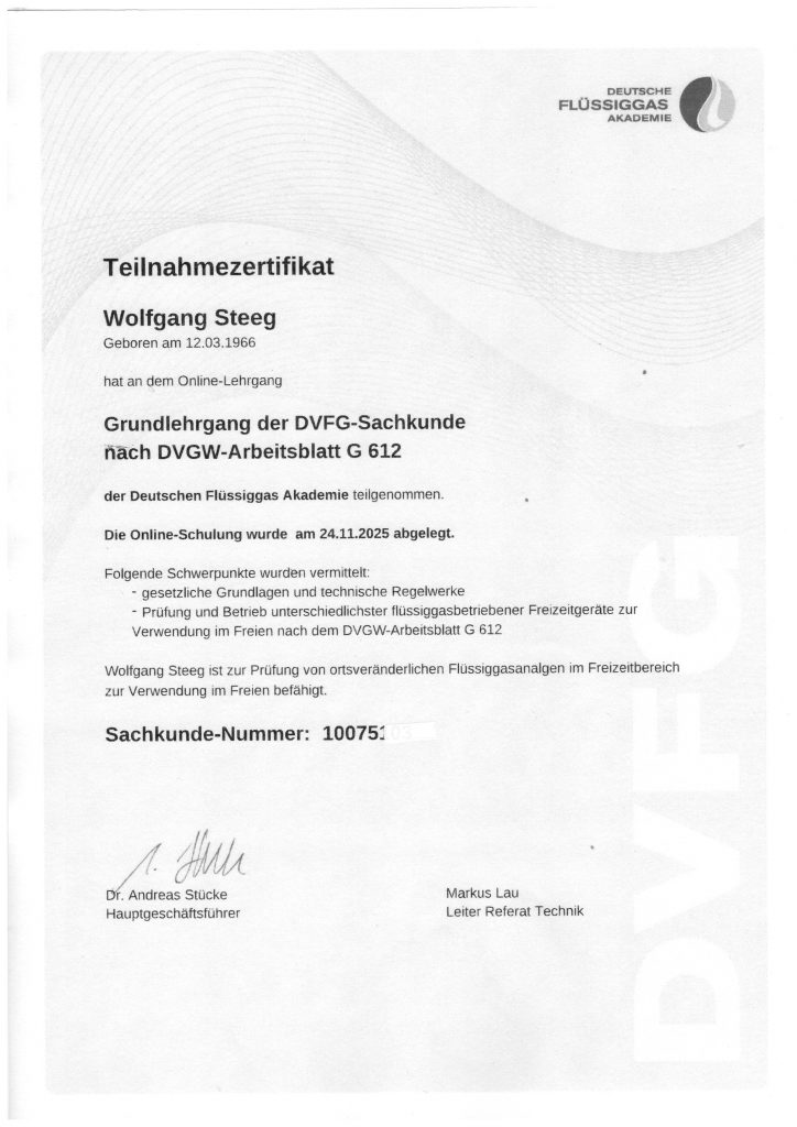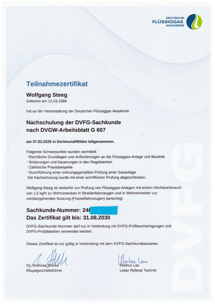 Schon 1998 wurde mir nach umfangreicher Schulung die Anerkennung als Sachkundiger des DVFG für die Gasprüfung von Flüssiggasanlagen in Freizeitmobilen nach DVGW Arbeitsblatt G 607 verliehen.
