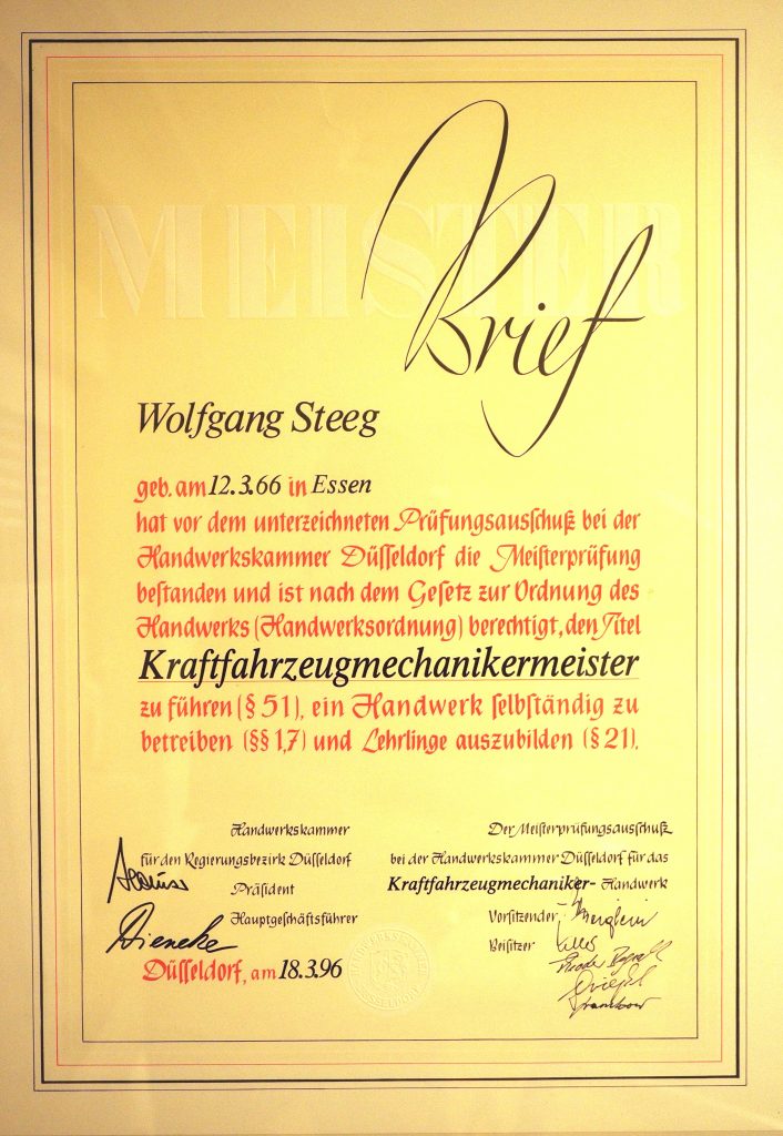 Im März 1996 habe ich meine Prüfung zum Kfz-Meister bestanden.
